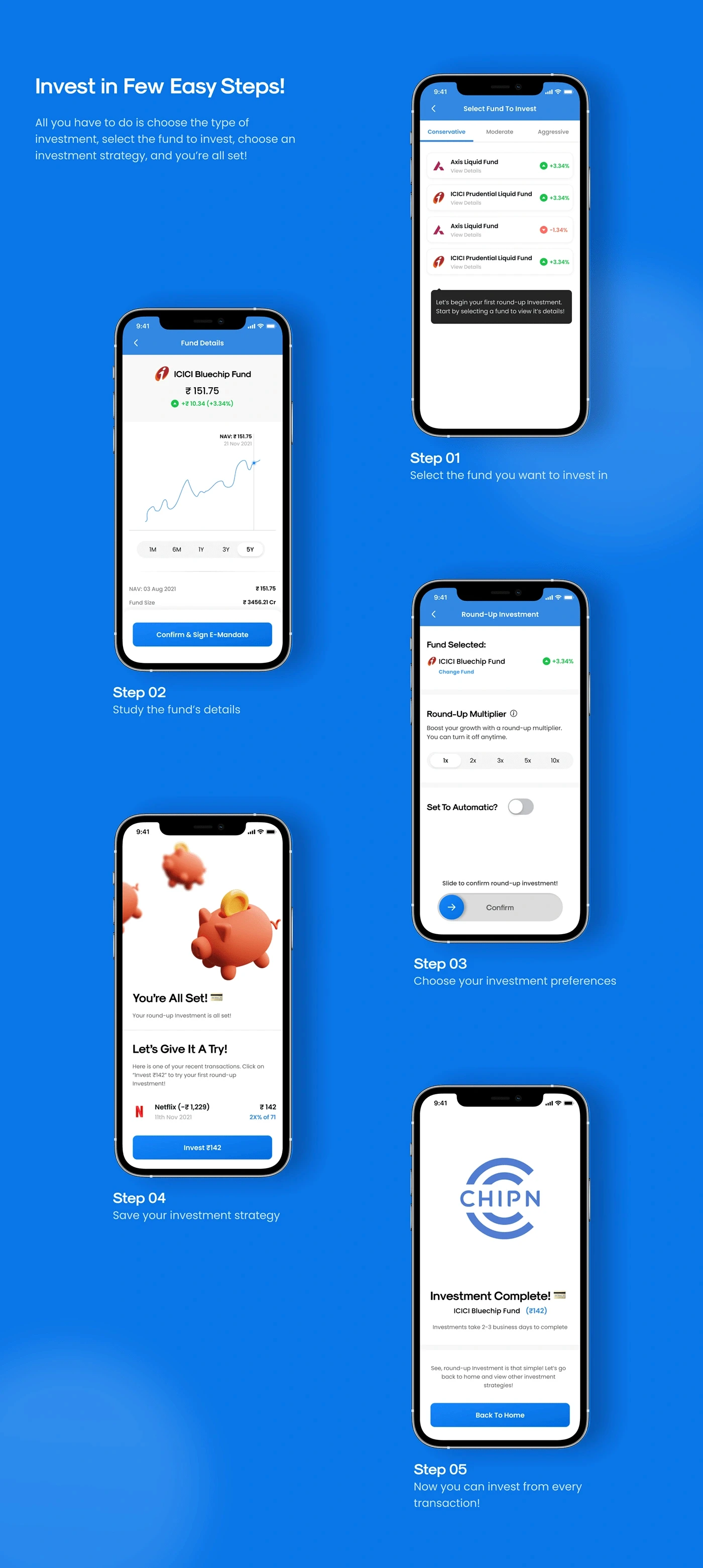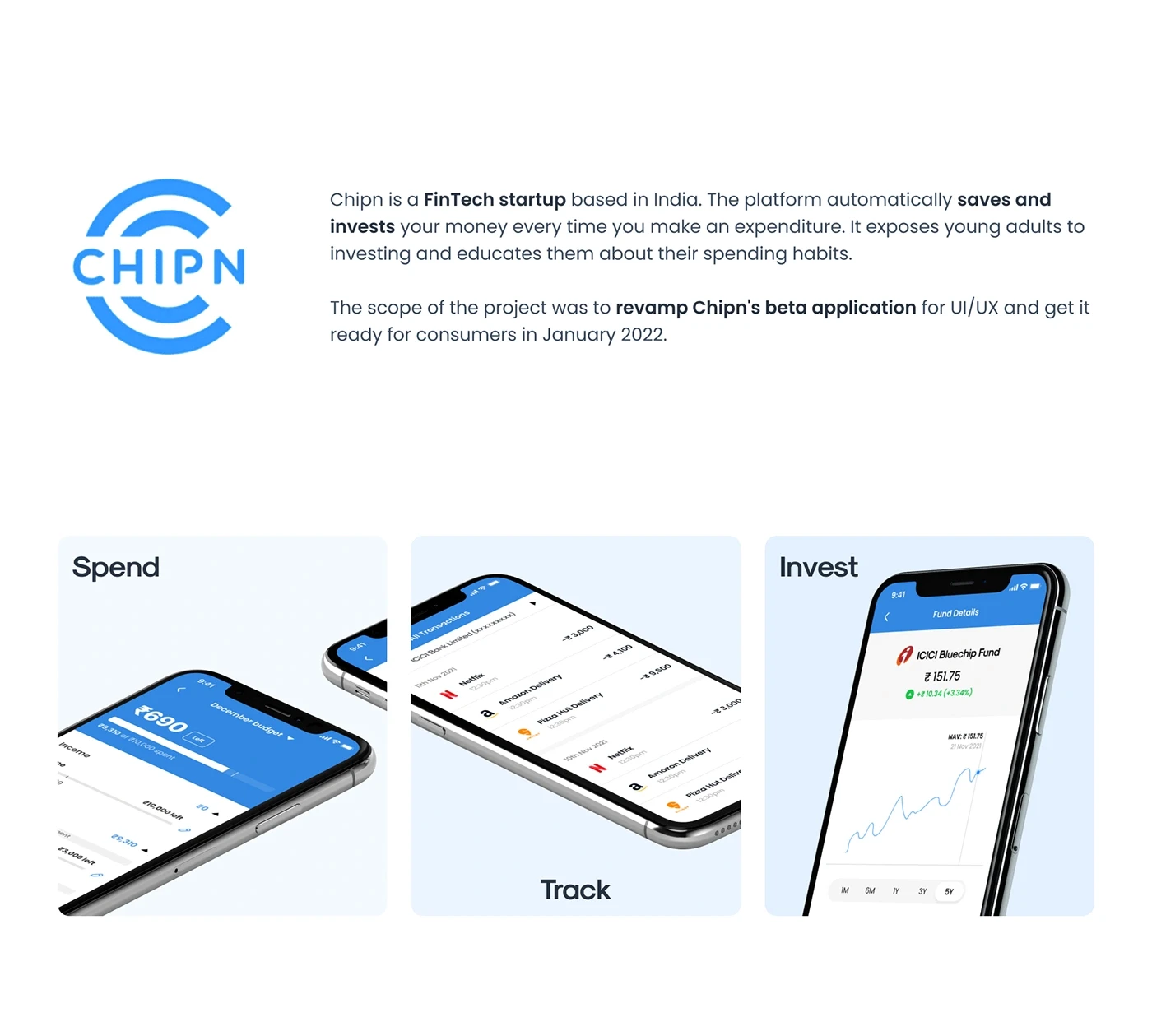 Chipn is a FinTech startup based in India. The platform is targeted for young adults to help them automatically save and invest every time they make an expenditure.